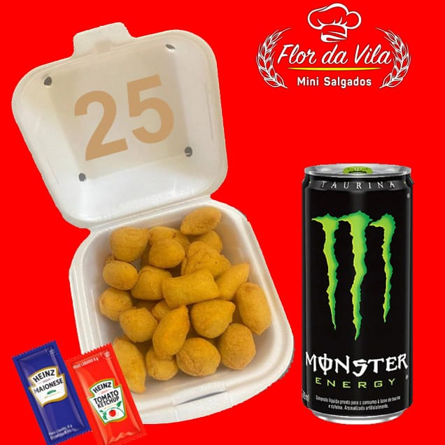 25 Mini Salgados Mistos(13grs) - 5 Sabores + Monster 269ml + Molhos Heinz. Emb Isopor (25-7)
