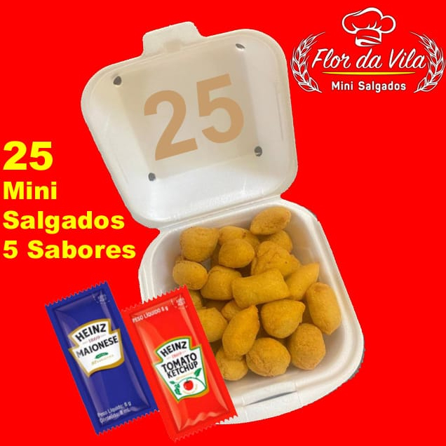 25 Deliciosos mini salgados(13grs). 5 Sabores: Coxinha, presunto e queijo, rissole de carne, enroladinho de salsicha e requeijão. Acompanha molhos Heinz. Embalagem Isopor. Não aceitamos alterações neste Mix promocional.