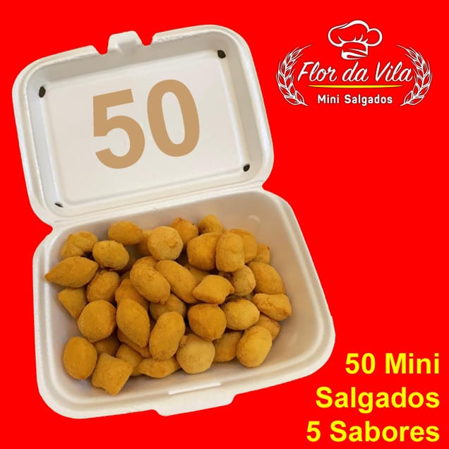50 Deliciosos mini salgados(13grs). 5 Sabores: Coxinha, presunto e queijo, rissole de carne, enroladinho de salsicha e requeijão. Embalagem de isopor. Não aceitamos alterações neste Mix promocional.