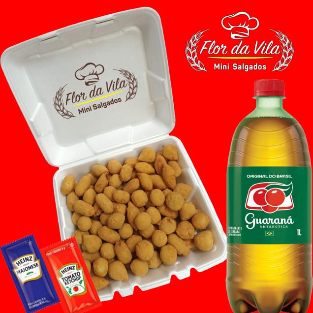 100 Deliciosos mini salgados(13grs). 5 Sabores: Coxinha, presunto e queijo, rissole de carne, enroladinho de salsicha e requeijão. Acompanha Guaraná Antarctica 1L. Acompanha molhos Heinz. Embalagem Isopor. Não aceitamos alterações neste Mix promocional.