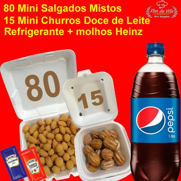 80 Mini Salgados Mistos(13grs) - 4 Sabores: Coxinha, pres./queijo, enroladinho de salsicha e requeijão. Acompanha 15 Mini Churros Doce de Leite + Pepsi 1L + Molhos Heinz. Embalagem Isopor. Não podemos fazer alterações neste Mix promocional.