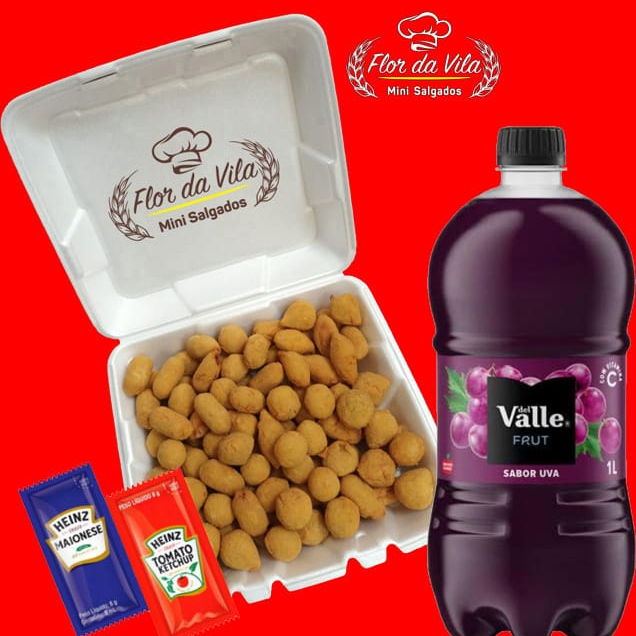 100 Deliciosos mini salgados(13grs). 5 Sabores: Coxinha, presunto e queijo, rissole de carne, enroladinho de salsicha e requeijão. Acompanha Suco Del Valle Uva 1,5L. Acompanha Molhos Heinz. Embalagem Isopor. Não aceitamos alterações neste Mix promocional.