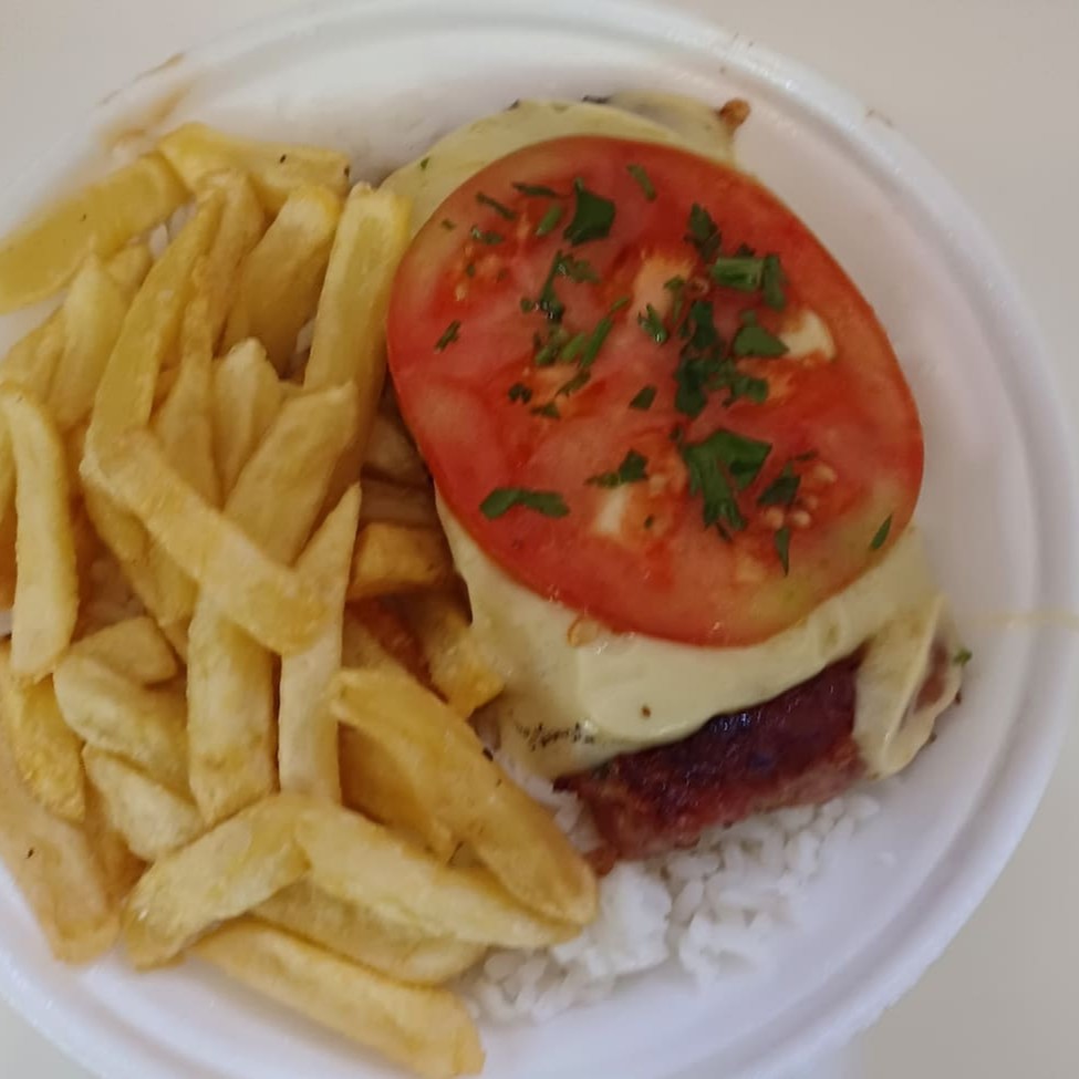 Parmegiana de Miolo de alcatra servido em embalagem separada. Acompanha arroz, feijão, fritas, farofa e vinagrete.