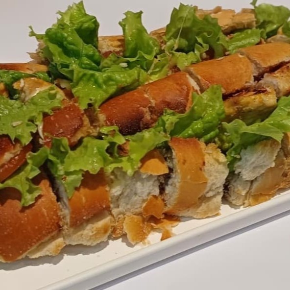 Baguete cortada em boca de anjo, filé de frango, queijo mussarela, bacon, azeitonas pretas, alface e tomate.