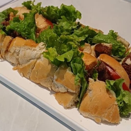 Baguete cortada em boca de anjo, contra filé, queijo mussarela, presunto, bacon, ovo, azeitonas preta, alface e tomate.
