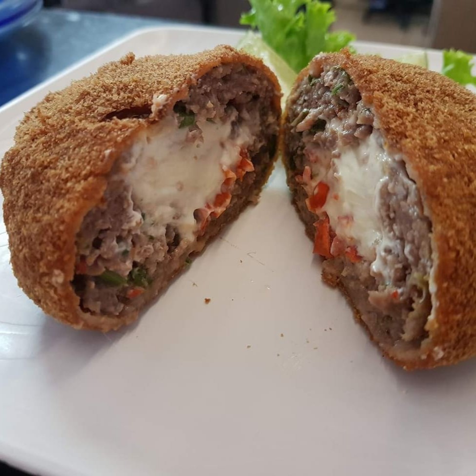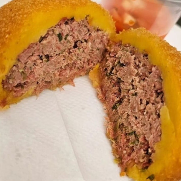 Tradicional bolinho de carne temperada, receita de mais de 30 anos, recheado com cream cheese e pimenta biquinho.