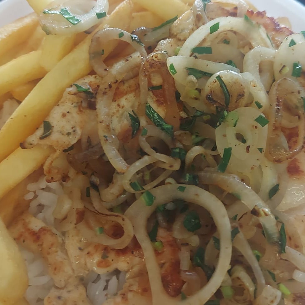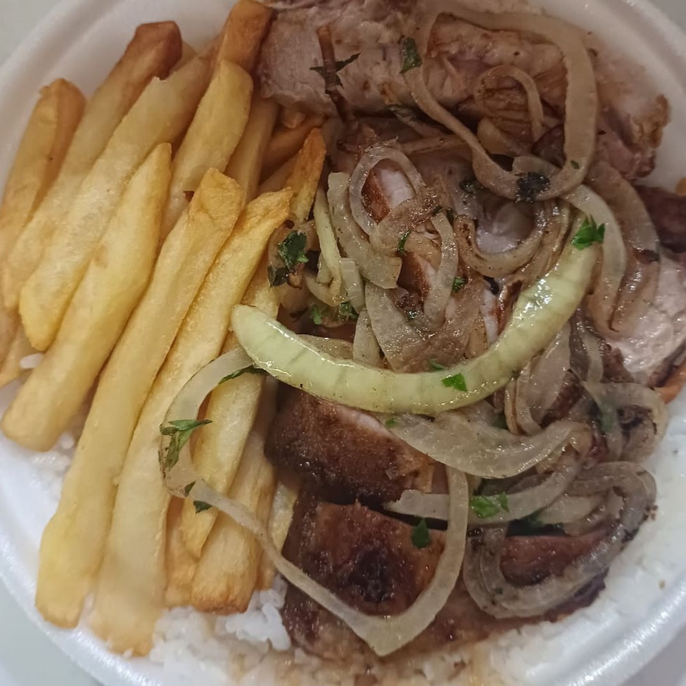 Lascas de pernil tenderizado e acebolado na chapa. Acompanha arroz, feijão, fritas, farofa e vinagrete.