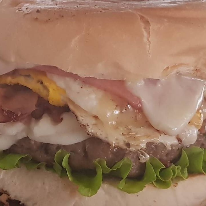 Pão brioche, hambúrguer caseiro de 180 g, mussarela , bacon, ovo, presunto, alface e tomate