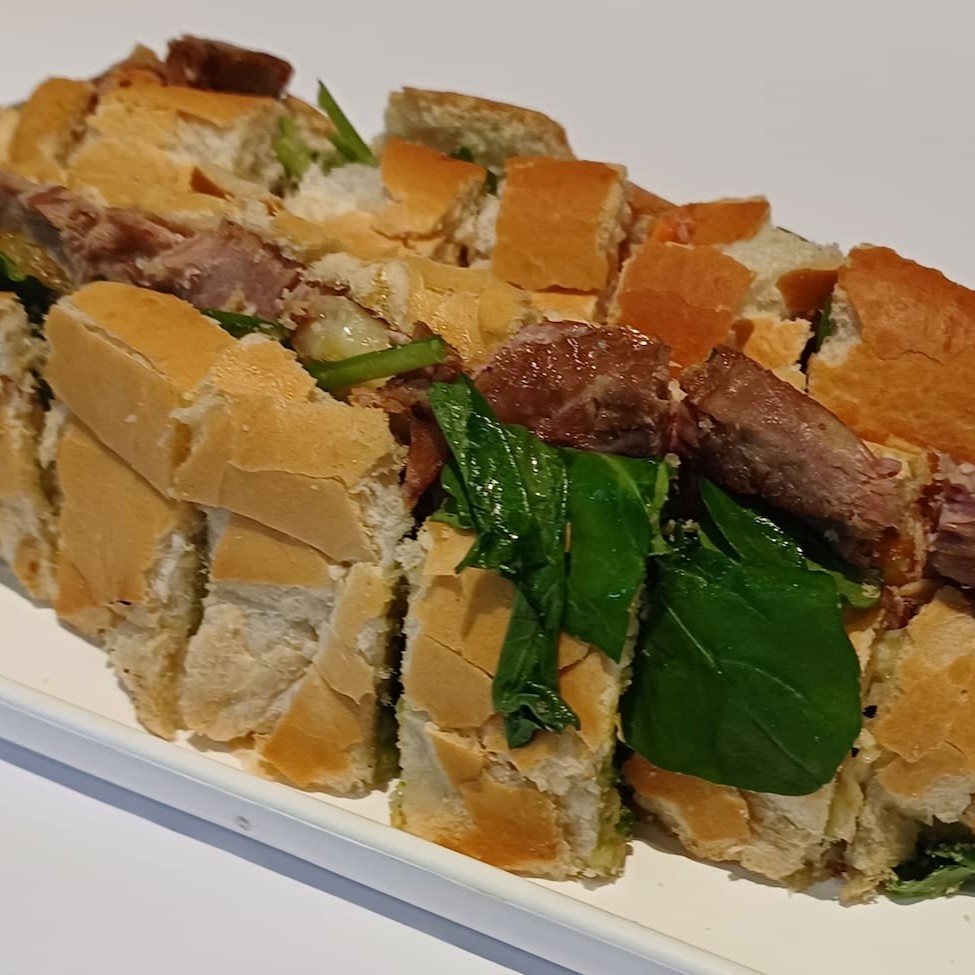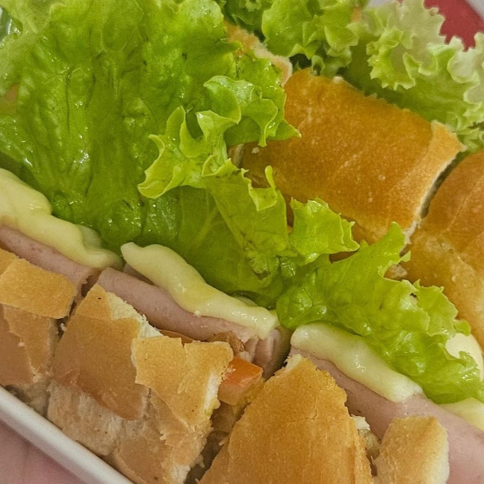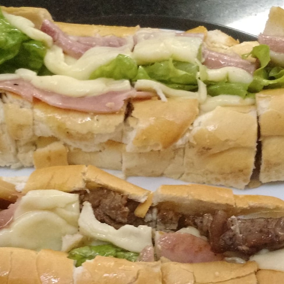 Lanche psicodélico servido na Baguete e tem em seu recheio pernil tenderizado, rosbife, presunto, queijo mussarela, mortadela, tomate, azeitona preta, azeite e salsinha.