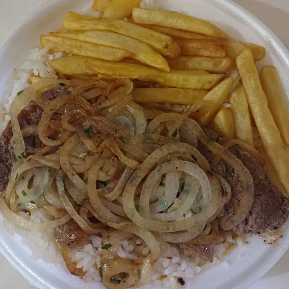 Marmitex mini de contra filé grelhado acebolado; acompanha arroz, feijão e fritas.