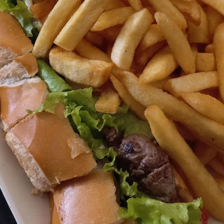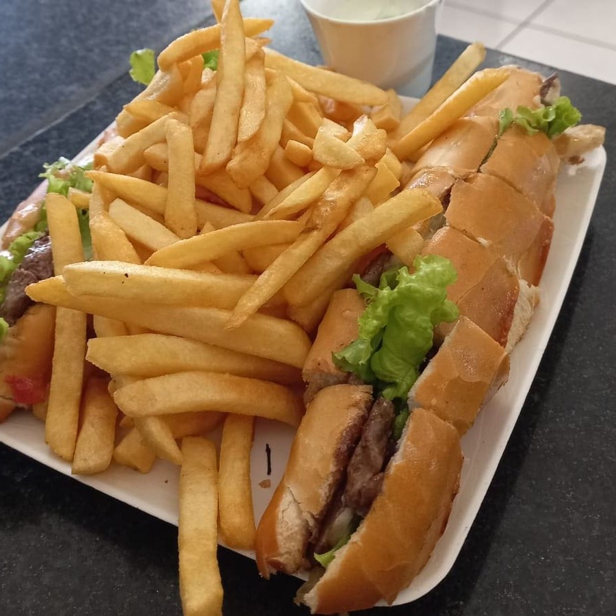 Lanche cortado em boca de anjo: pão frances, filé mignon, vinagrete, azeitona preta, bacon, queijo provolone e alface. Acompanha Fritas