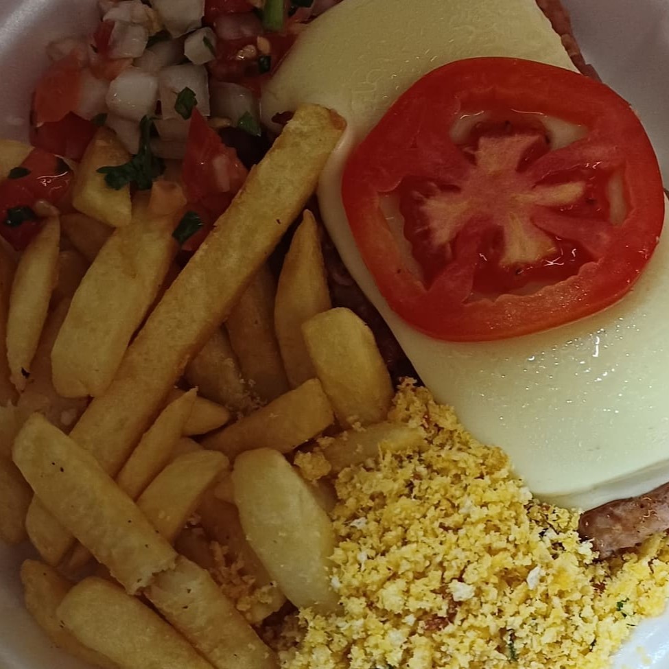 Linguiça Suína Pura Caseira grelhada com mussarela e tomate, Acompanha arroz, feijão, fritas e farofa e vinagrete.