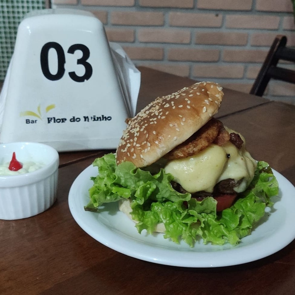 Pão, hambúrguer artesanal 180g, queijo, bacon, onion rings, maionese temperada e salada.