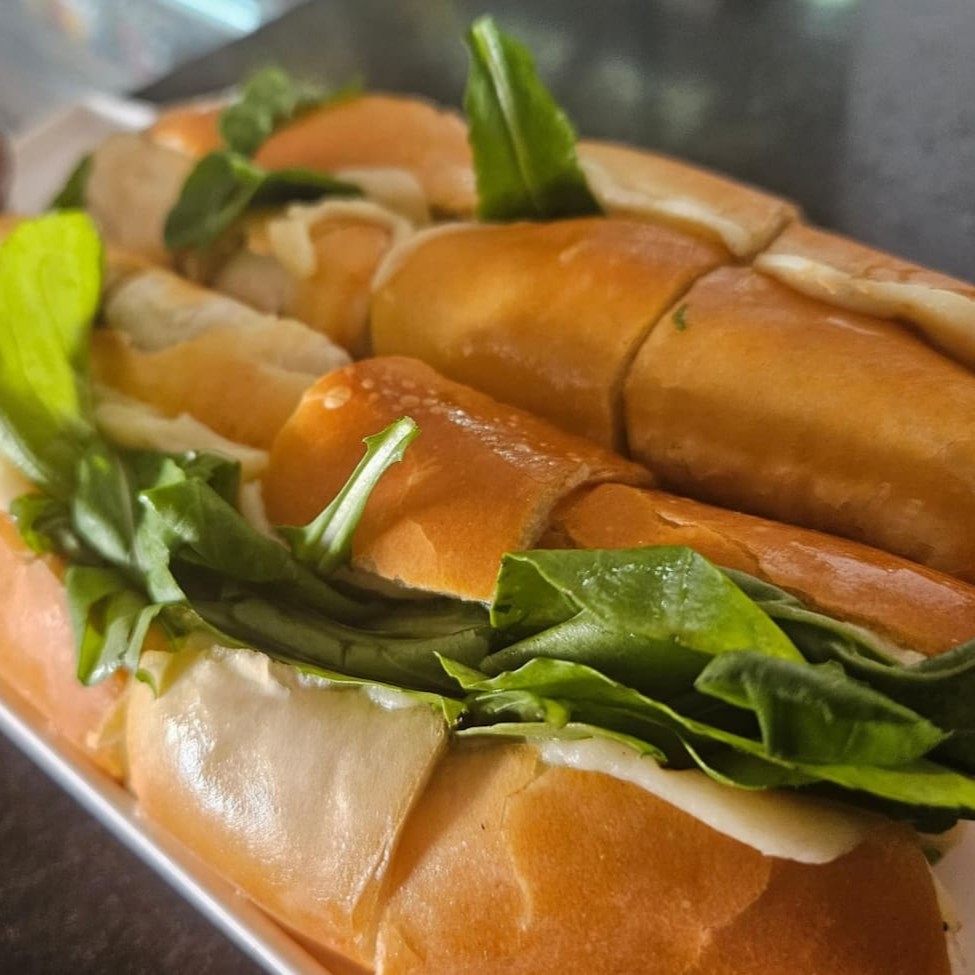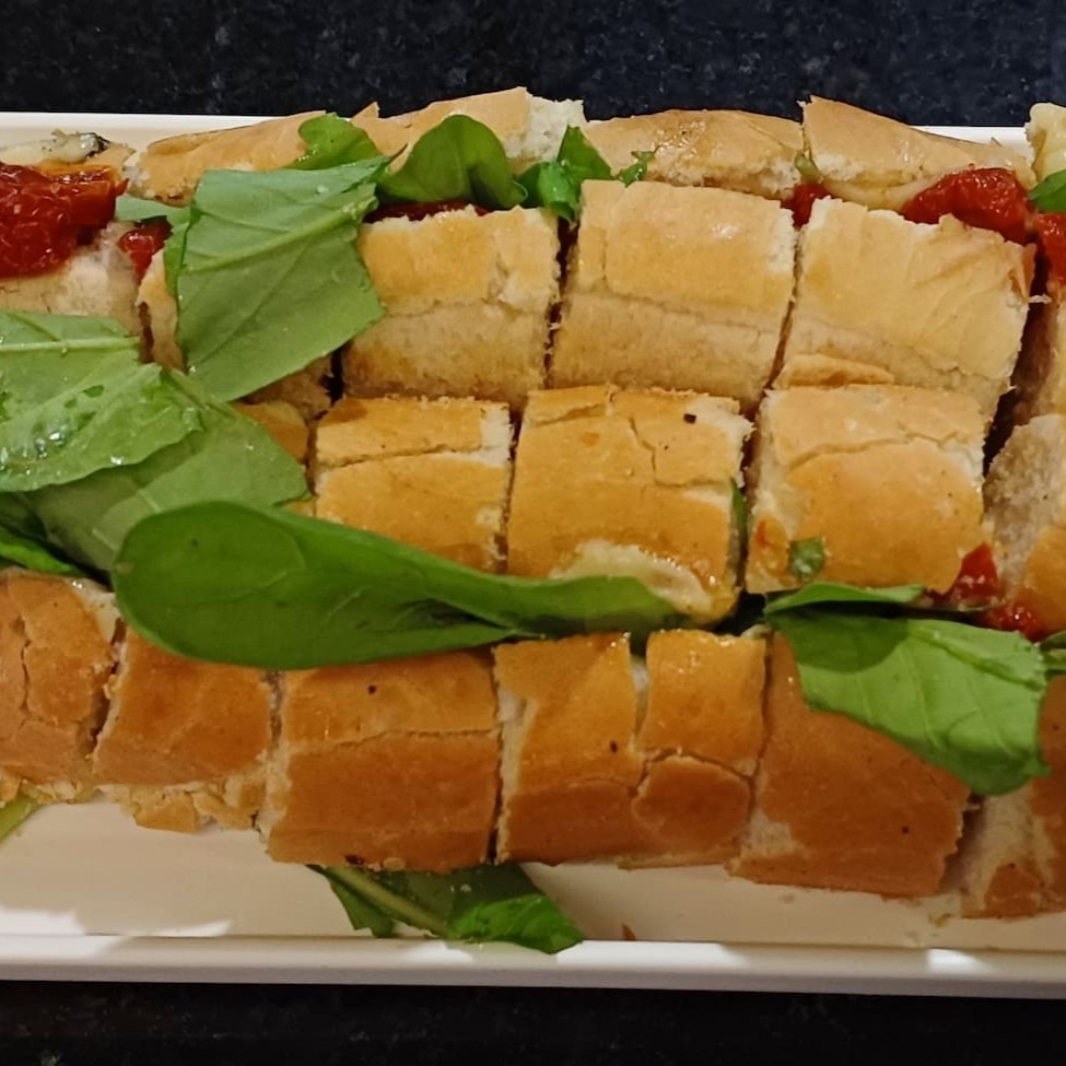 Baguete cortada em boca de anjo, filé de frango, queijo mussarela, Catupiry, milho e orégano.