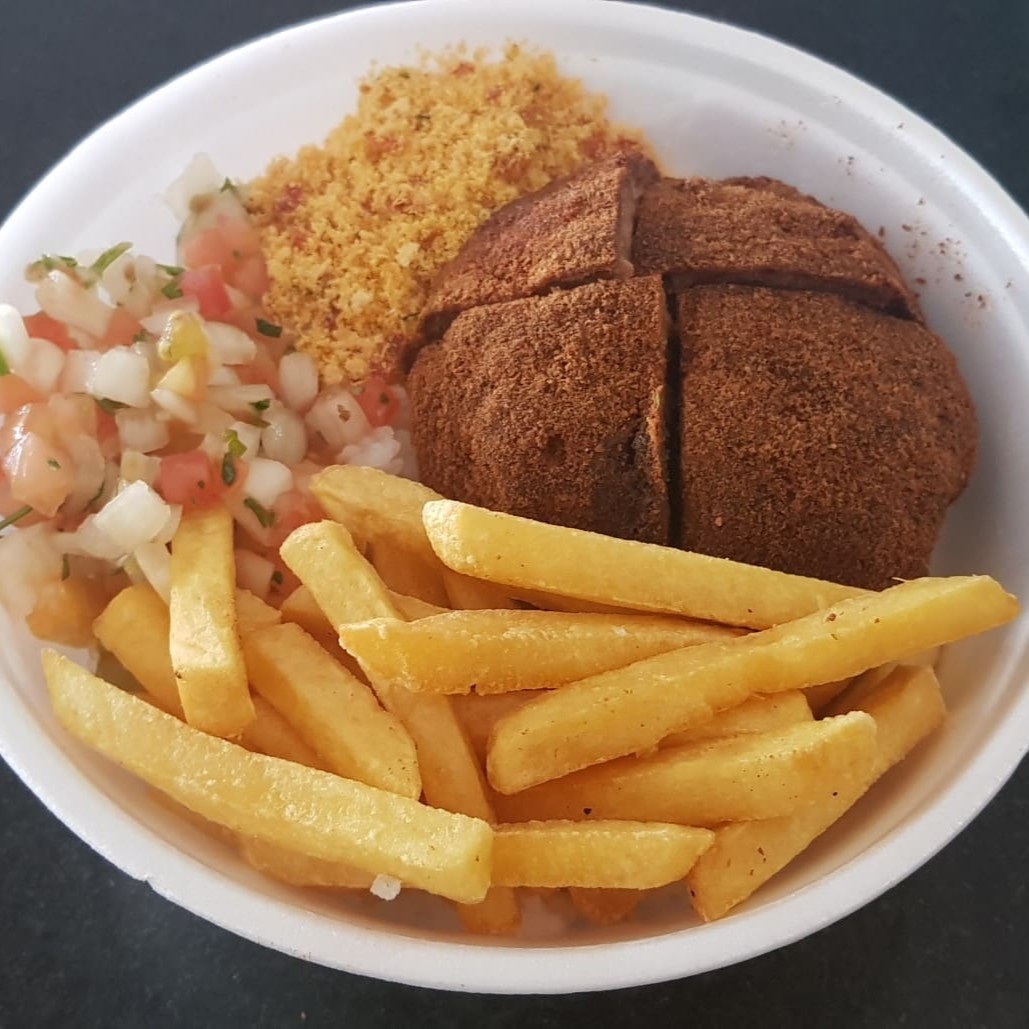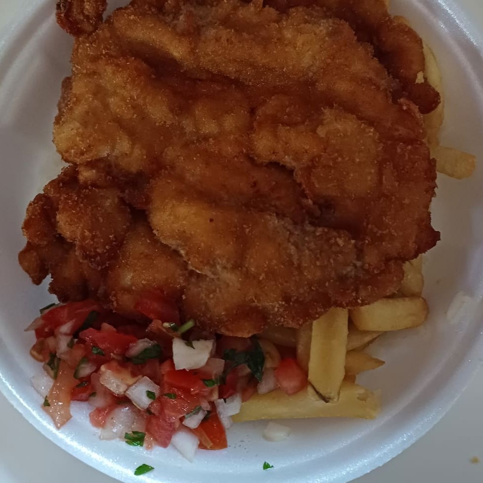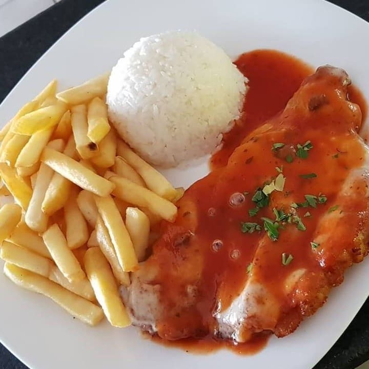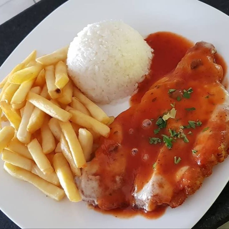 Filé de frango empanado à milanesa, acompanha arroz, feijão, fritas, farofa e vinagrete.