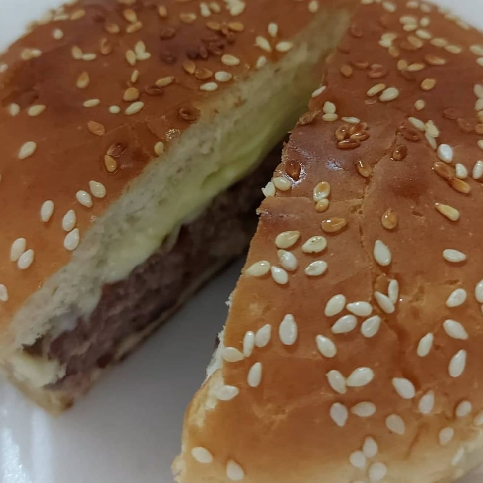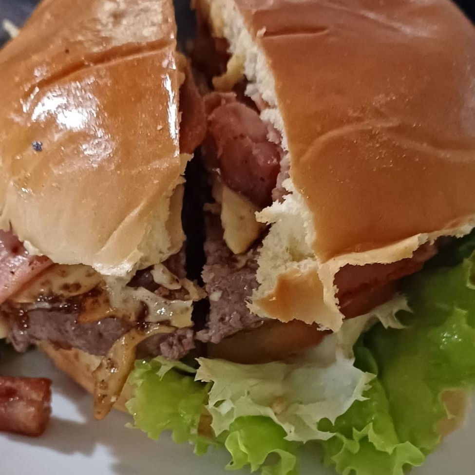 Pão de hambúrguer, hambúrguer caseiro, queijo e bacon.
