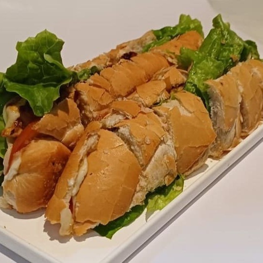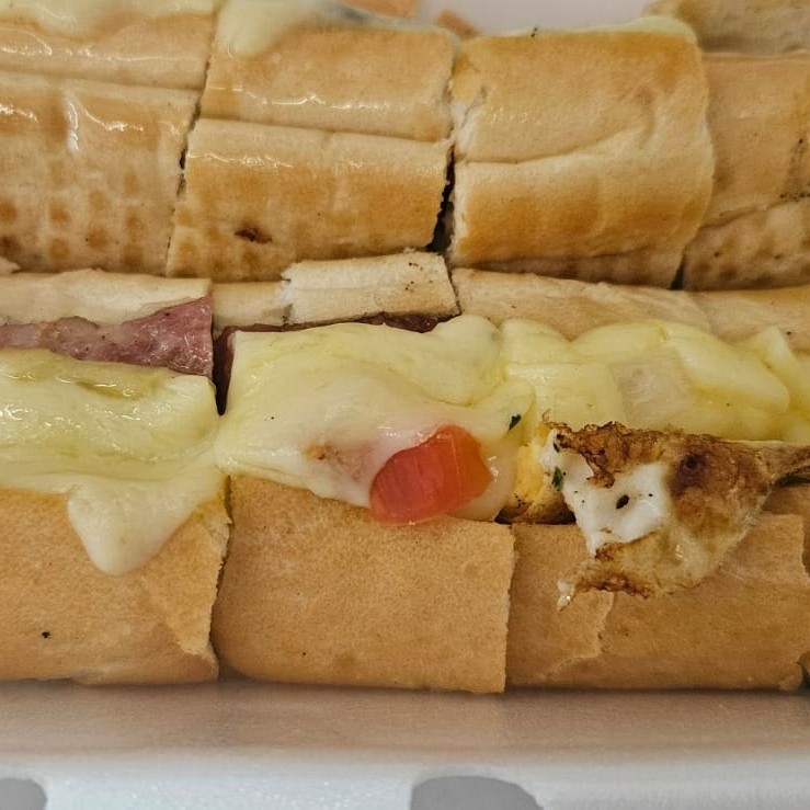 Lanche cortado em boca de anjo, servido na baguete, com calabresa, queijo provolone, tomate e azeitona.