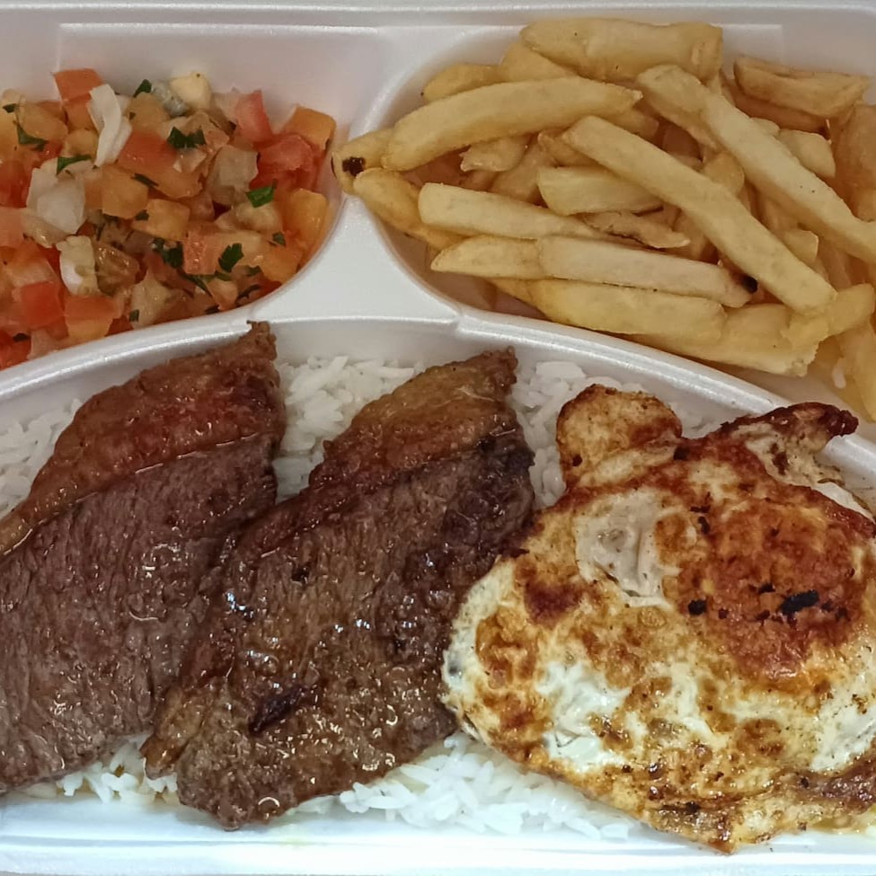 Picanha na chapa, servida em embalagem com repartições: acompanha arroz, feijão, fritas, ovo na chapa, vinagrete e farofa