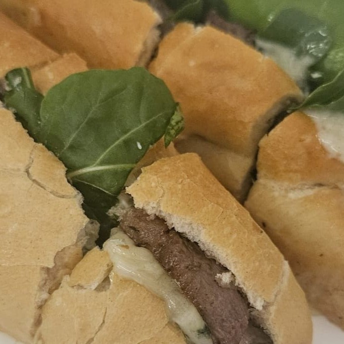 Baguete cortada em boca de anjo com filé mignon, gorgonzola e rúcula. Acompanha porção pequena de fritas.