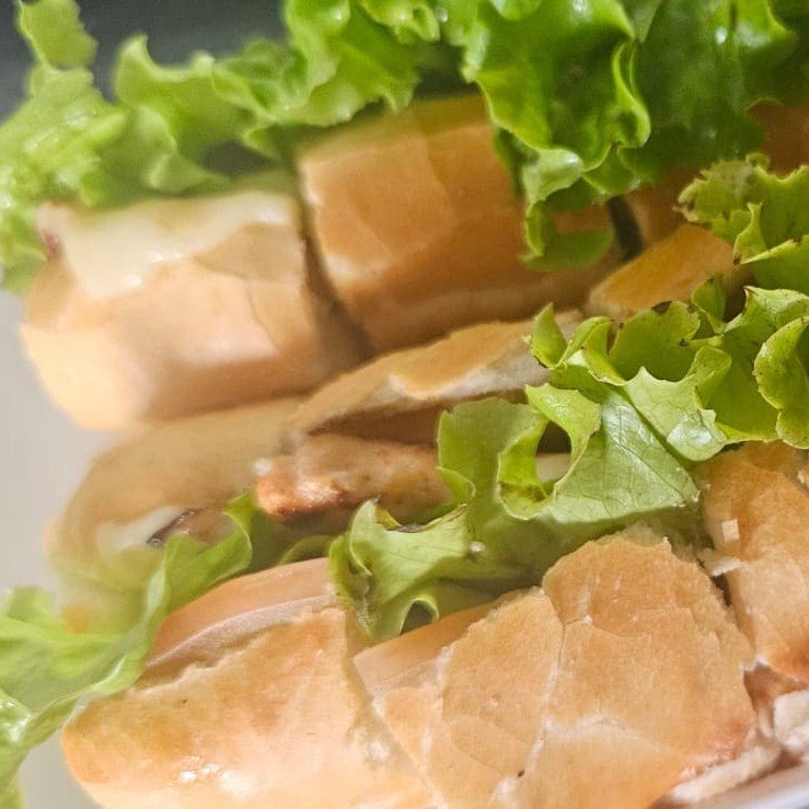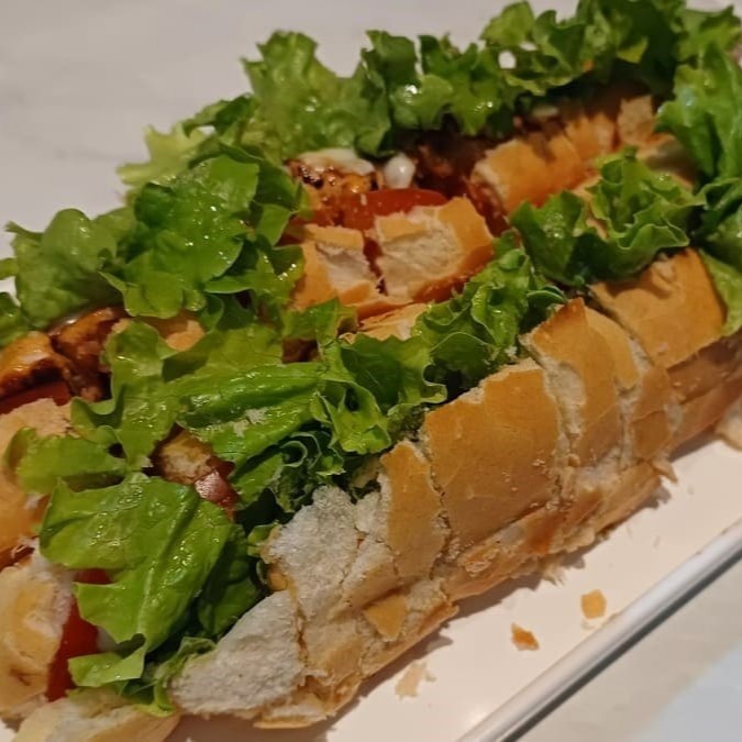 Baguete cortada em boca de anjo, filé de frango, queijo mussarela, alface e tomate.