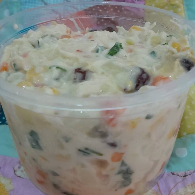 Maionese: Batata, Cenoura, Ervilha, Milho Verde, Cheiro Verde, Uva Passa, Frango Desfiado