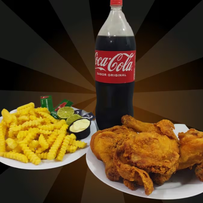 4 Sobrecoxas + 1 porção grande de Batata frita (300g) + 2 molhos (50g cada) + 1 Coca-Cola 600ml. Atenção: Limão e Sachê de Pimenta só serão adicionados se forem incluídos no carrinho. Alérgicos: Contém pimenta e glúten.