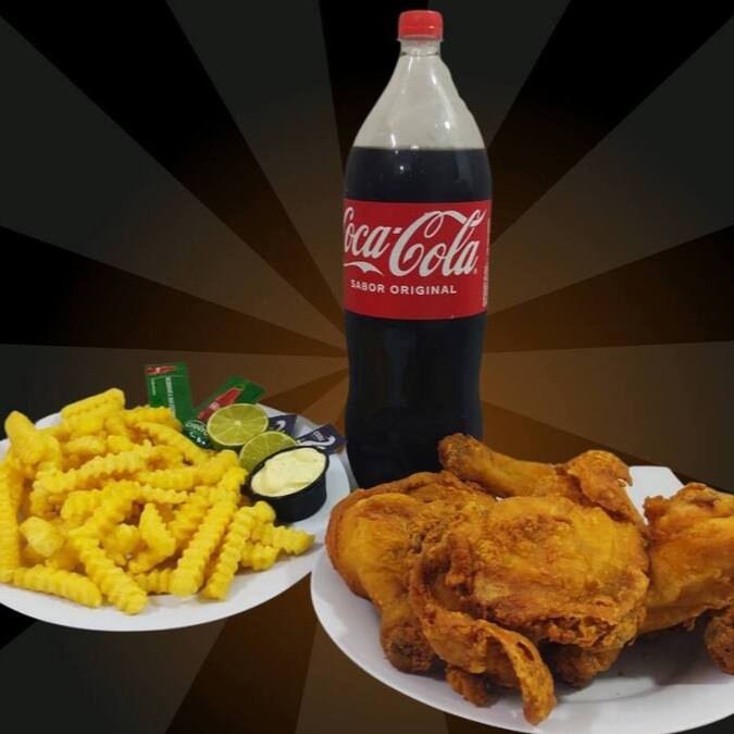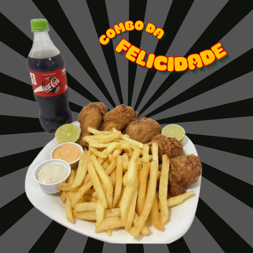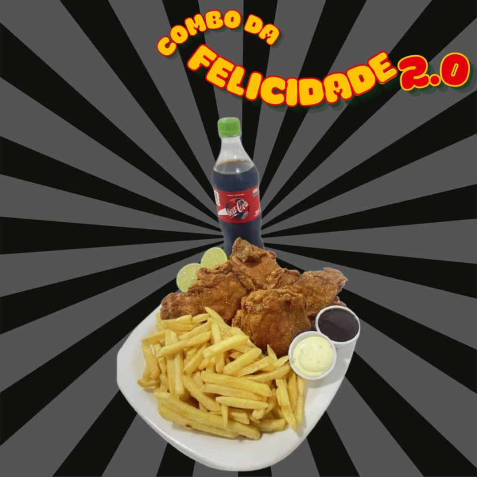 4 Sobrecoxas + 1 porção grande de Batata frita (300g) + 2 molhos (50g cada) + 1 Coca-Cola 600ml. Atenção: Limão e Sachê de Pimenta só serão adicionados se forem incluídos no carrinho. Alérgicos: Contém pimenta e glúten.
