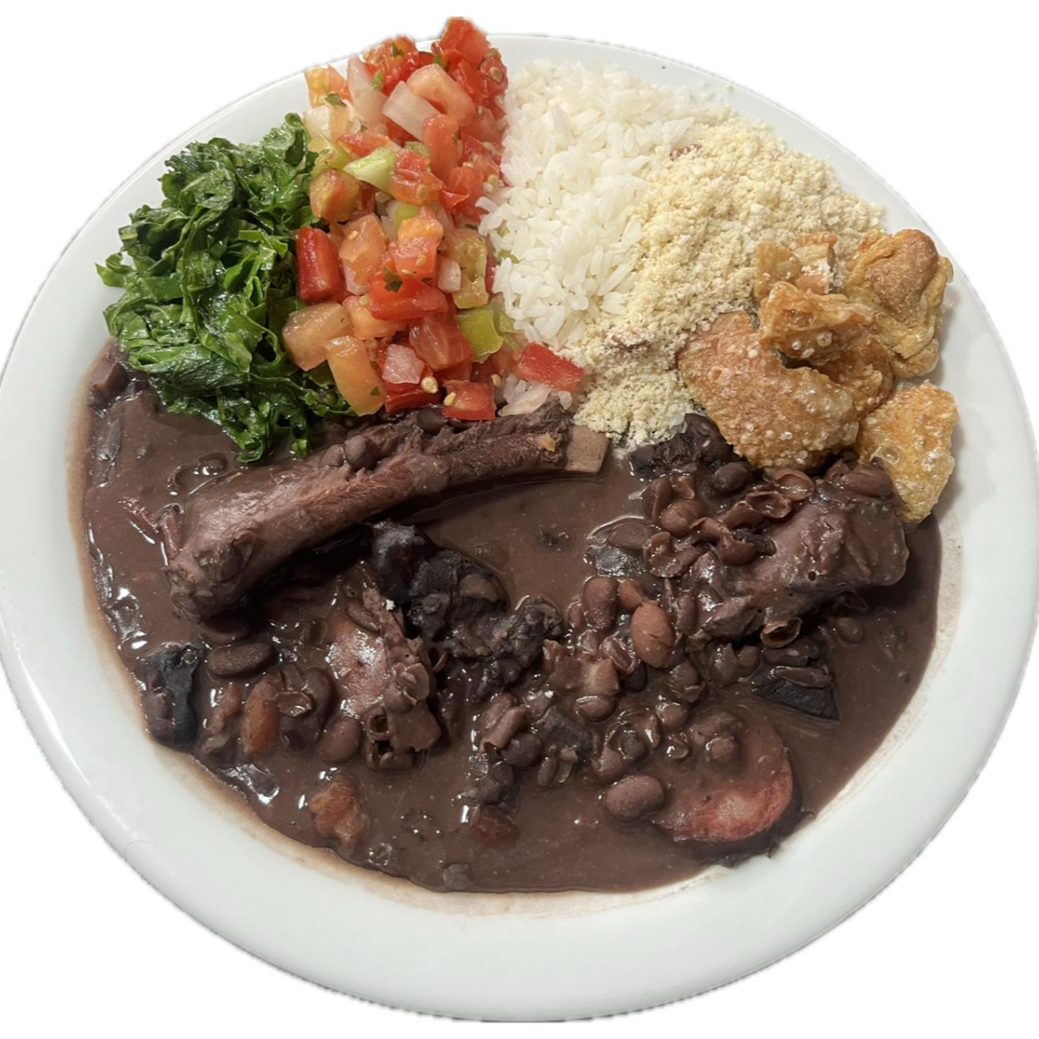 Feijoada completa da casa, preparada com feijão preto bem temperado e carnes selecionadas, acompanhada de arroz branco soltinho, farofa crocante, couve refogada no alho, vinagrete fresquinho e torresmo pururuca. Prato farto, sabor caseiro e aquele gostinho tradicional brasileiro que conquista em cada garfada. 🍽️😋
