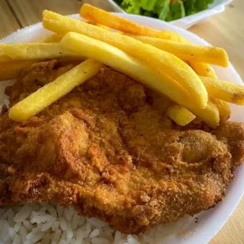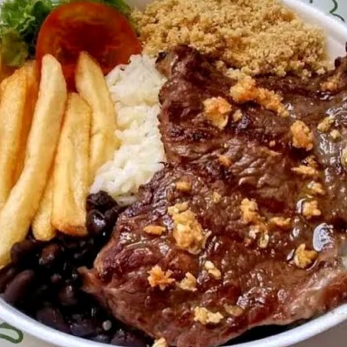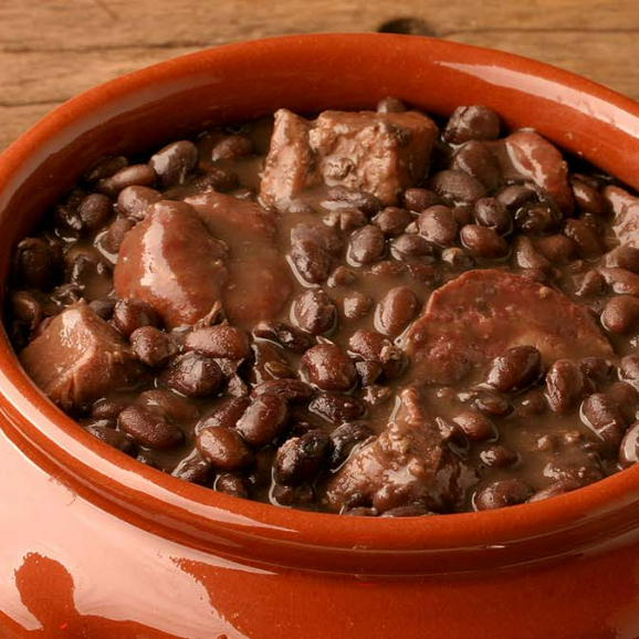 Arroz, feijoada, farofa, couve, vinagrete e torresmo. Feijoada com : costelinha, carne seca e calabresa.