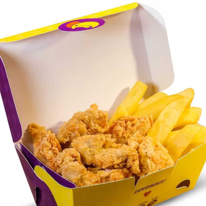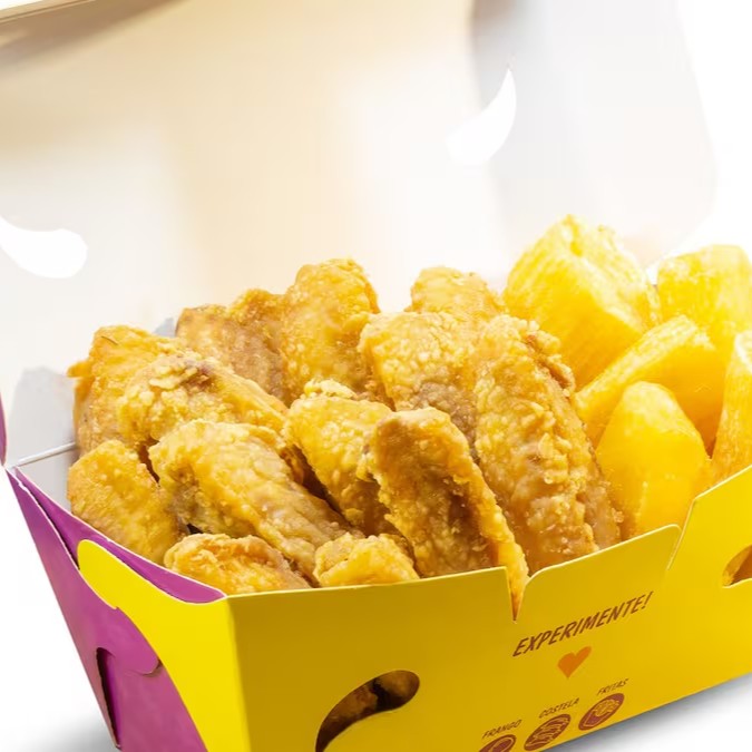 Deliciosos pedaços de filé de sobrecoxa sem osso (200 gr) empanados de forma crocante e suculento por dentro + acompanhamento 80 gr de (fritas ou mandioca) + uma opção de molho.