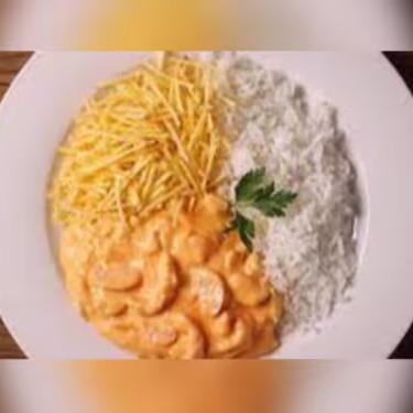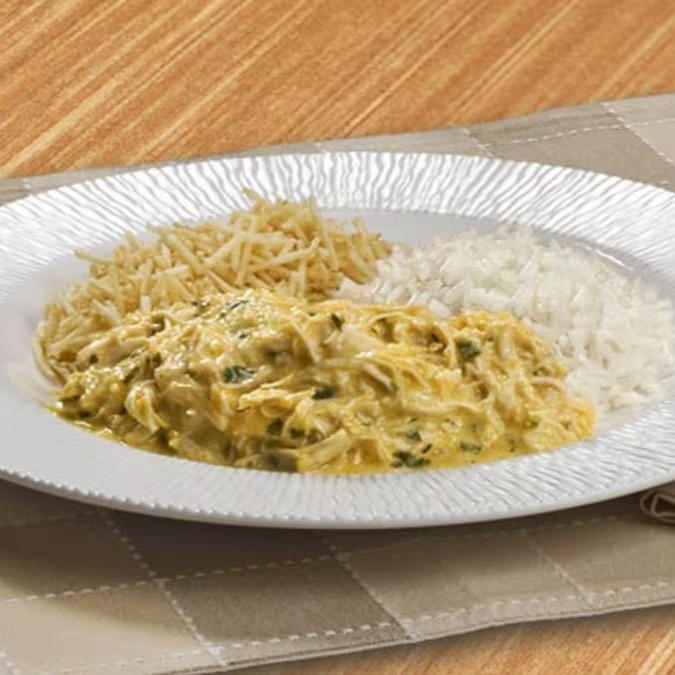 Delicioso prato a base de frango requeijão e creme de leite com arroz e batata