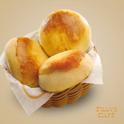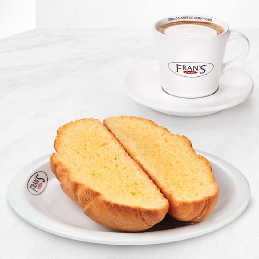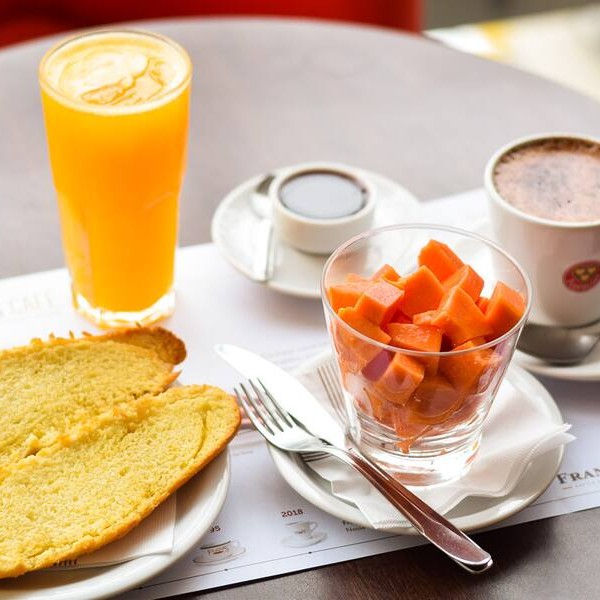 1 bebida grande*, 1 suco de laranja, e Fran´s baguete normal ou integral tostada com manteiga, 1 porção de mamão e saborosa geleia de frutas vermelhas.