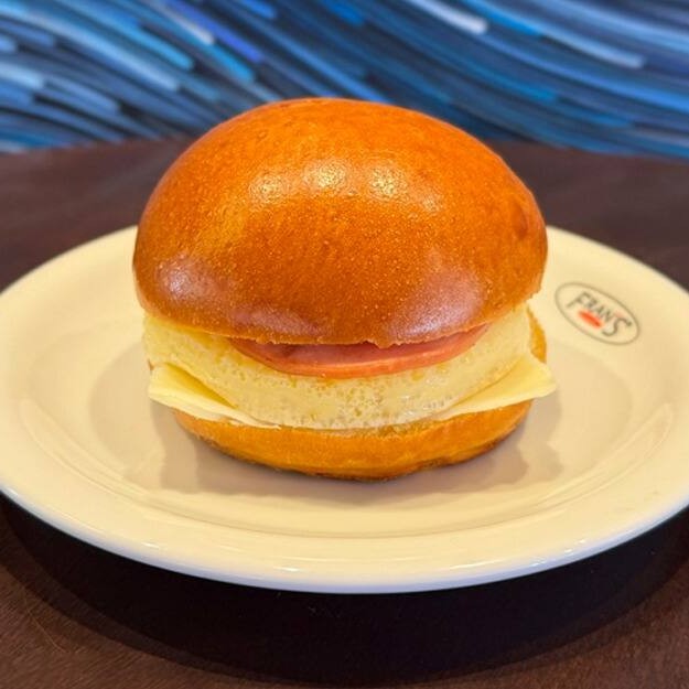 Pão de Brioche, omelete, bacon de lombo e muçarela .