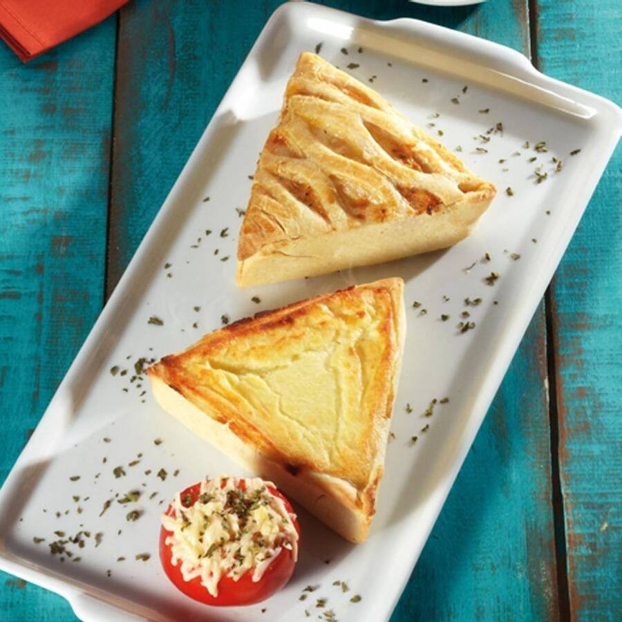 Deliciosa quiche de sabor queijos, acompanha de tomate gratinado ao forno com parmesão e azeite.