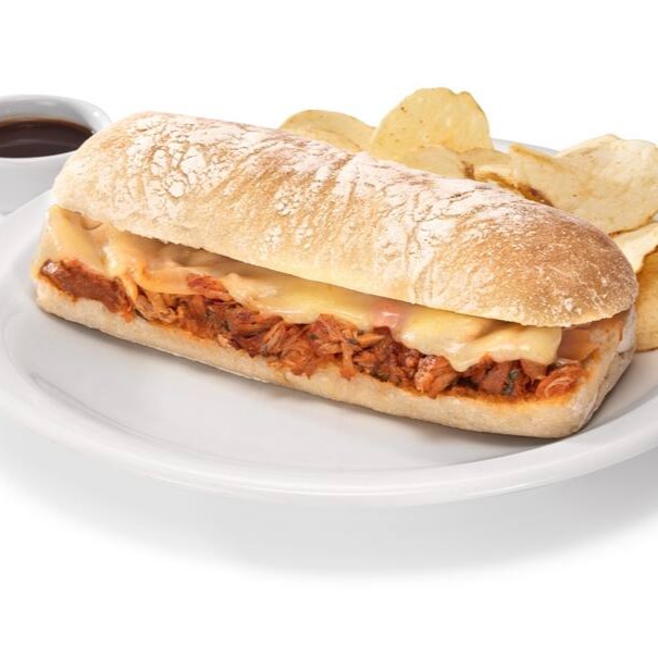 Pernil suíno com molho caseiro e muçarela na ciabatta. Acompanha batata chips.