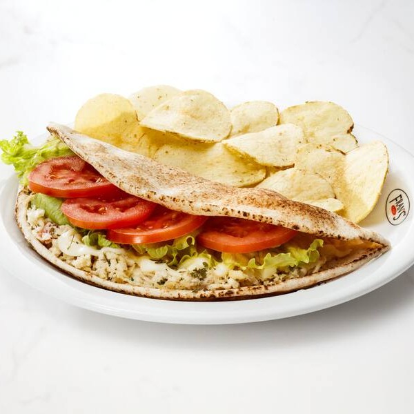 Frango desfiado, muçarela , requeijão, tomate e alface no pão sírio.