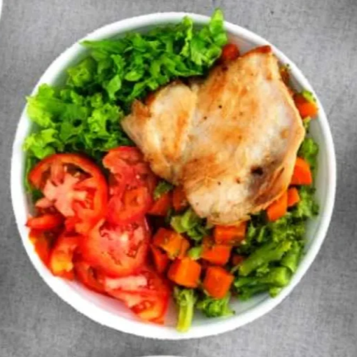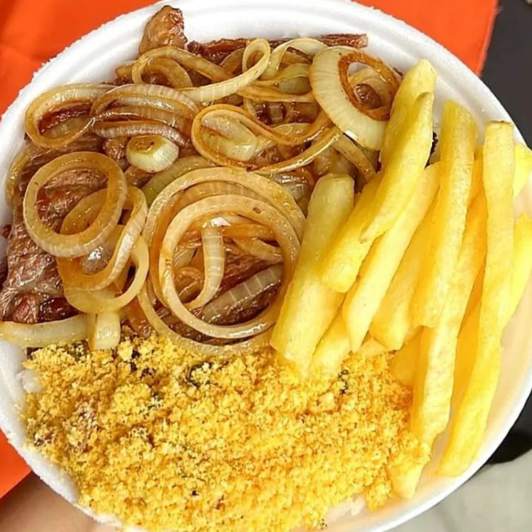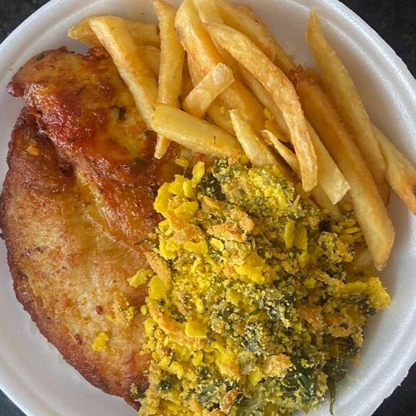 Acompanha: Arroz branco, feijão, file de frango grelhado,torta de legumes, fritas, farofa de pvt