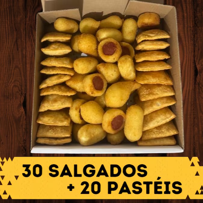 50 deliciosos mini salgados nas opções com 10 unidades de cada sabor: