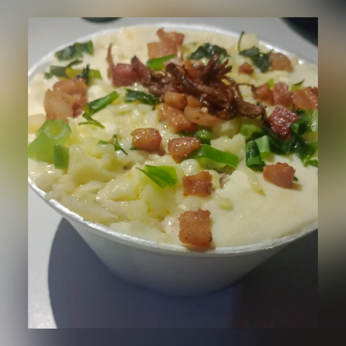 Um delicioso caldo feito com mandioca, frango desfiado, bacon, calabresa e um delicioso tempero caseiro. Você ainda tem a opção de turbinar seu caldo com coentro, pão e queijo ralado.