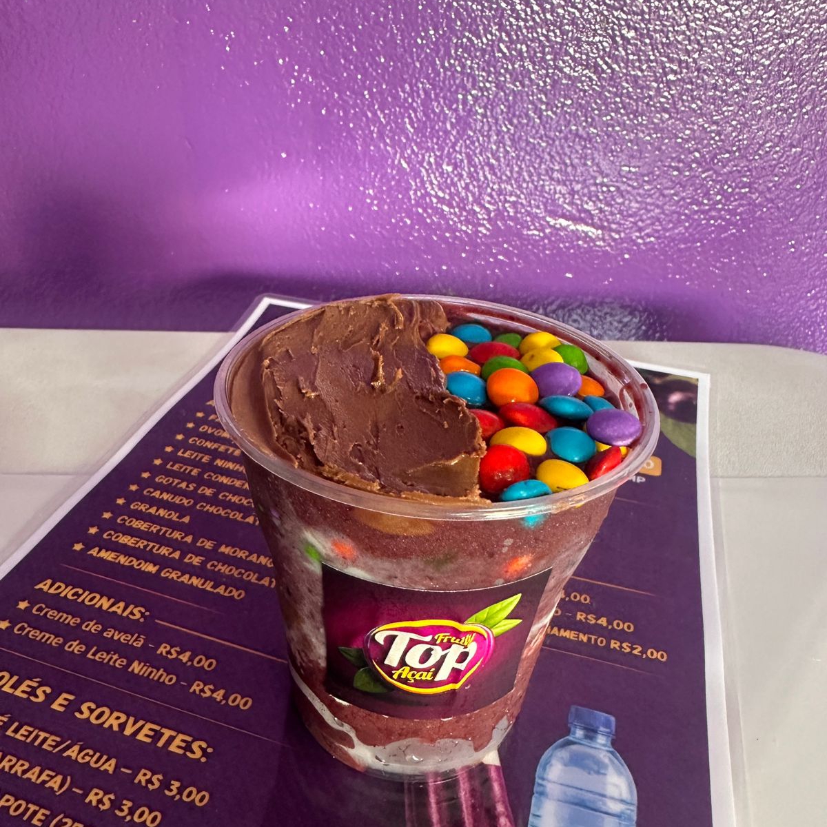 Este copo e de 250 ml ouro branco com creme de ninho e amendoim triturado.