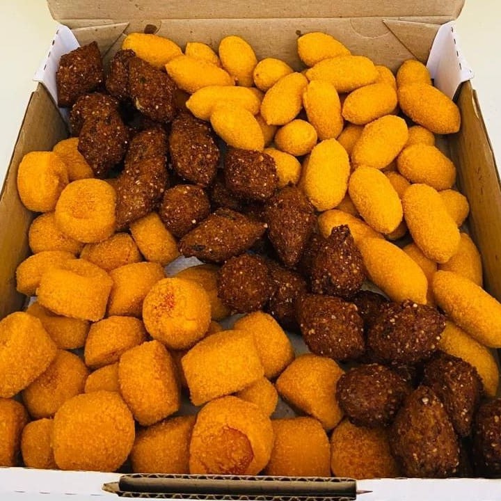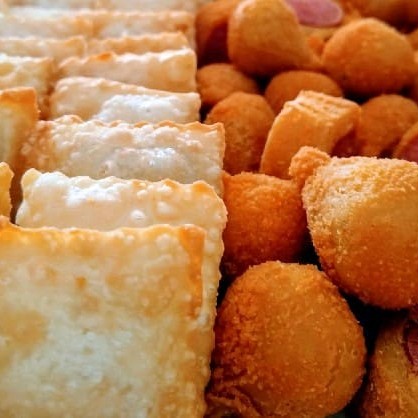 aqui vai 50 salgados mistos coxinha de frango bolinha de queijo tubinhos de presunto e queijo anéis de salsicha