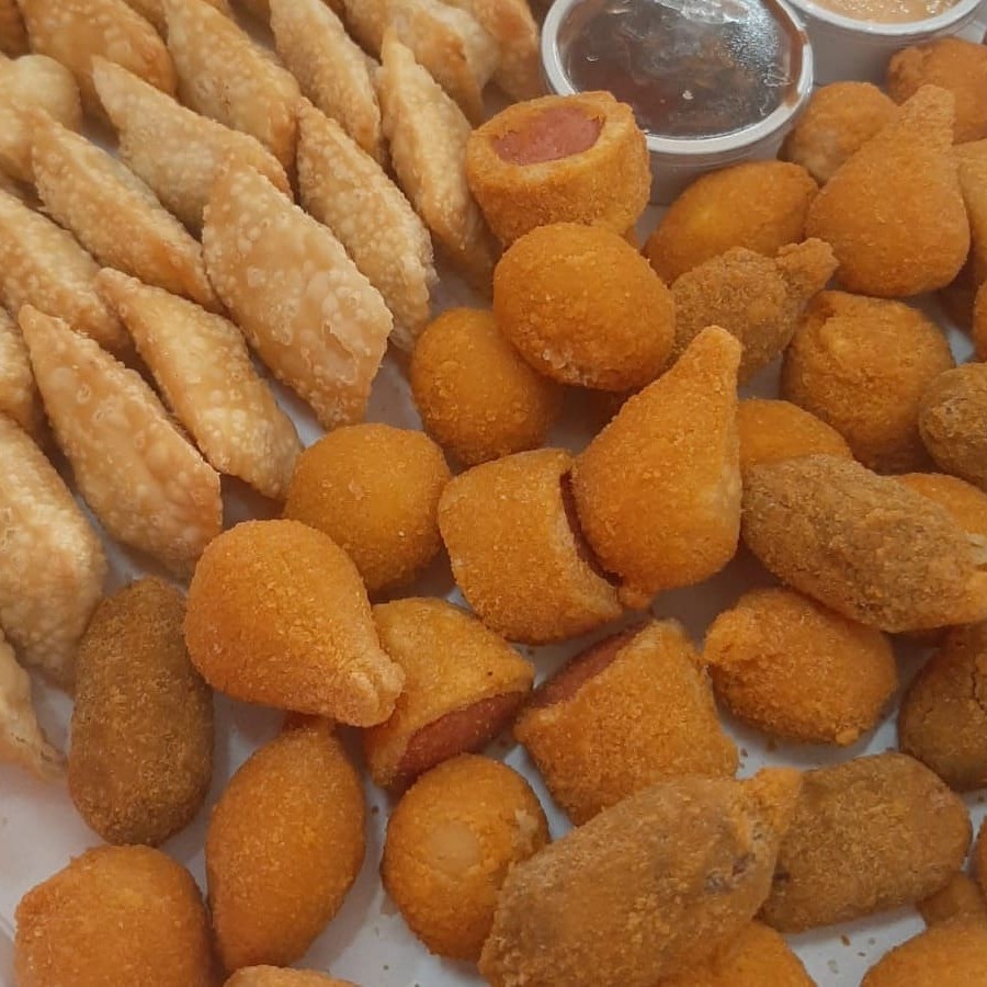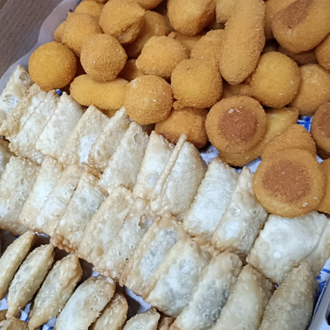 70 SALGADOS MISTOS COXINHA DE FRANGO BOLINHA DE QUEIJO TUBINHOS DE PRESUNTO E QUEIJO E ANEIS DE SALSICHA + 30 PASTEIS CARNE QUEIJO PIZZA OU FRANGO