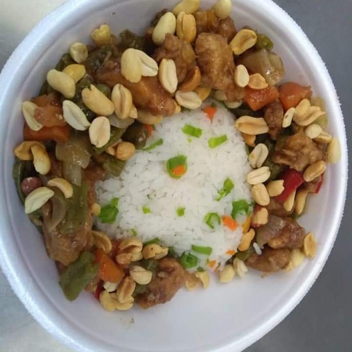 Filé de frango em cubos, legumes e arroz à grega