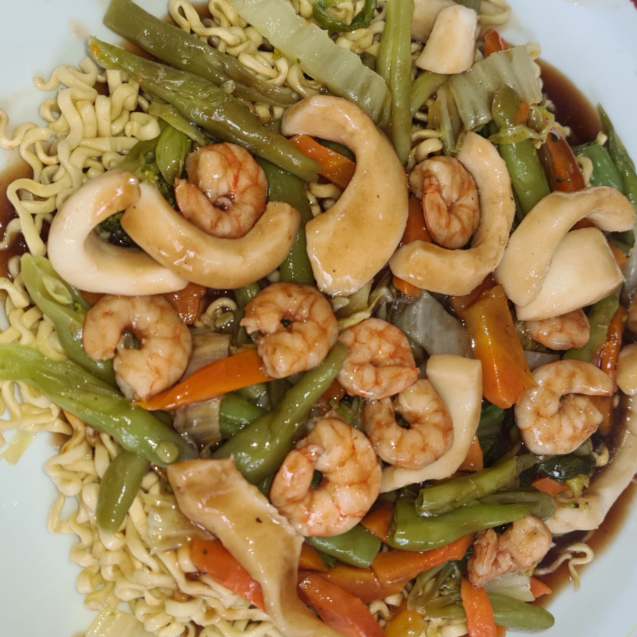 Com camarão, lula e legumes