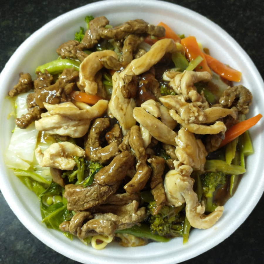 Com macarrão, carne bovina, frango e legumes