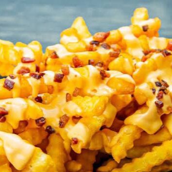 150g de batatas crinkles super crocantes, cobertas com cheddar cremoso e bacon crocante em pedacinhos.