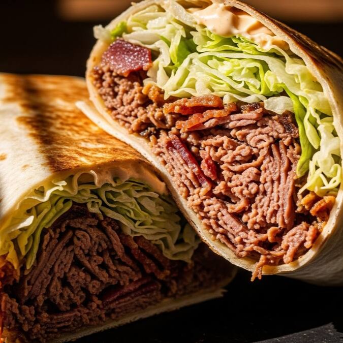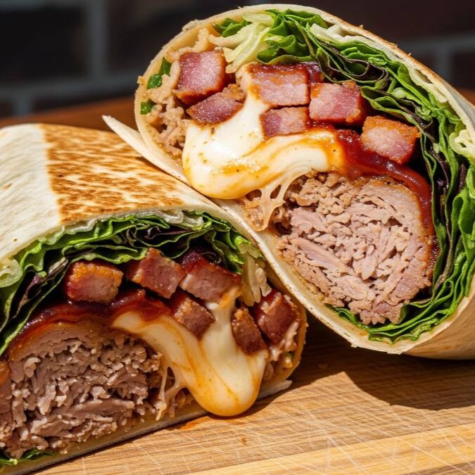 O Burrito Texano combina pernil desfiado e defumado, bacon crocante e mussarela derretida, finalizados com o toque defumado do barbecue e a leveza do mix de folhas. Uma explosão de sabor suculento e defumado que conquista do primeiro ao último pedaço!