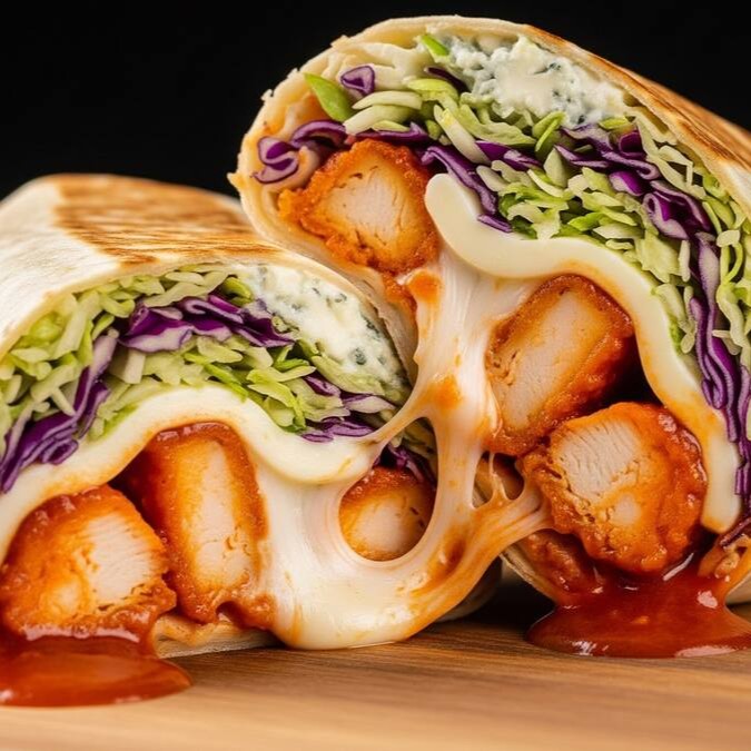 Crocância por fora, personalidade por dentro. Frango empanado na panko, mussarela, creme blue cheese, molho Buffalo e mix de repolhos. Um burrito ousado, cremoso e cheio de textura.