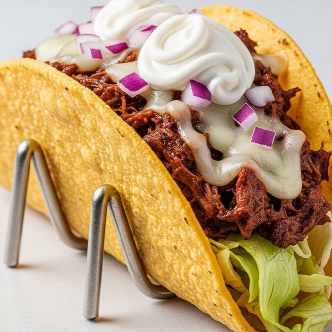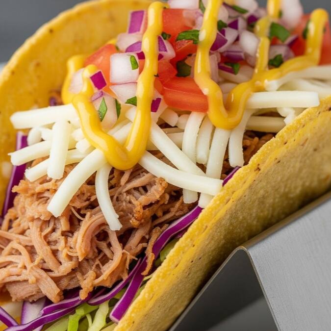 Sabor que domina qualquer apetite. Carne bovina desfiada, mussarela, sour cream, cebola roxa e alface, tudo dentro do clássico taco crocante. Um taco equilibrado, cremoso e cheio de personalidade.