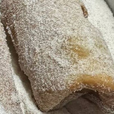 Mini burrito frito com recheio cremoso de banana, finalizado com açúcar de baunilha e canela.